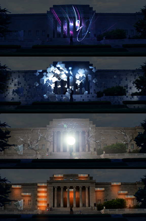 Quixotic approached me to help develope style frames for a live performance and building projection project they were creating for The Nelson-Atkins Museum of Art. These are some of the many frames produced for the grand finale.